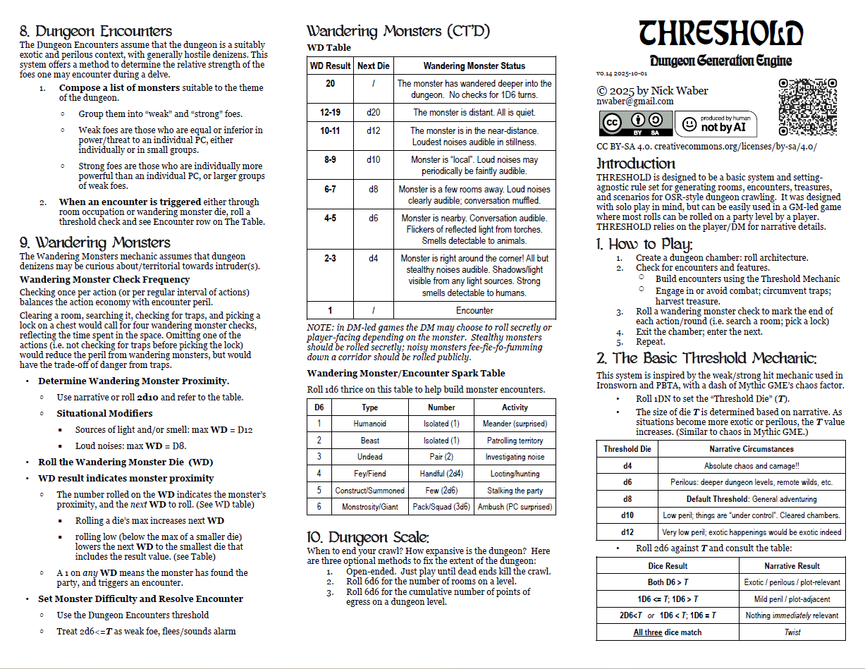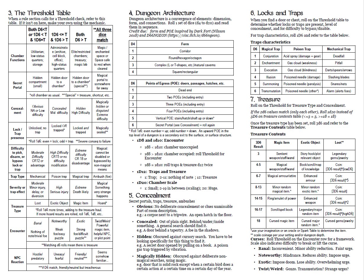 THRESHOLD is a toolkit for generating dungeons for solo TTRPG play (also works for GM-led games). Format is a single 8.5x11" sheet of paper; trifold pamphlet design. The mechanics are setting- and system-agnostic; just grab your favourite TTRPG system and some dice, and get rolling.
