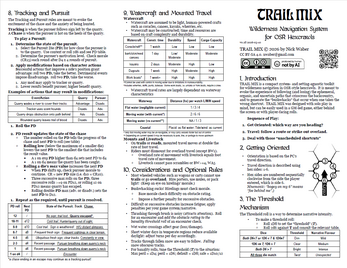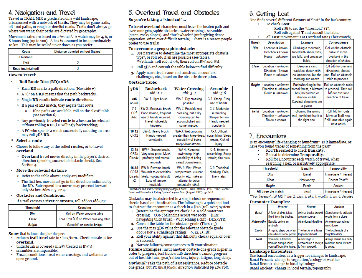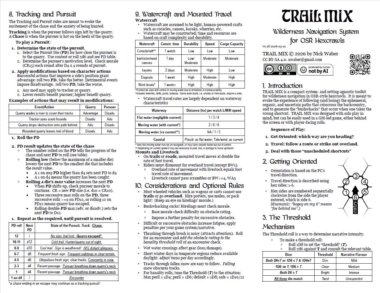 TRAIL MIX is a set of backcountry navigation mechanics for TTRPG hexcrawl adventures. The rules are designed to evoke wilderness travel with unfamiliar trails, off-trail movement, bushwhacking, and tracking/pursuit. The tools are designed for solo play, but work equally well for GM-led games. TRAIL MIX is setting- and system-agnostic; most play testing has been with OSR fantasy systems (i.e. Basic Fantasy, Cairn 1e, Knave 1e, Shadowdark), but is designed to be applicable to nearly any system and any setting where wilderness travel is a relevant feature.